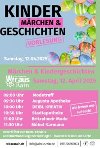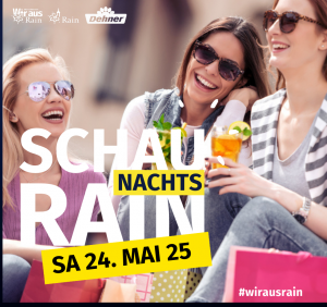 Wir laden Sie herzlich ein zum Late-Night-Shopping Event “SCHAU NACHTS RAIN” am Samstag, den 24. Mai 2025 von 17:00 — 23:00 Uhr in Rain am Lech und freuen uns sehr. Kommen